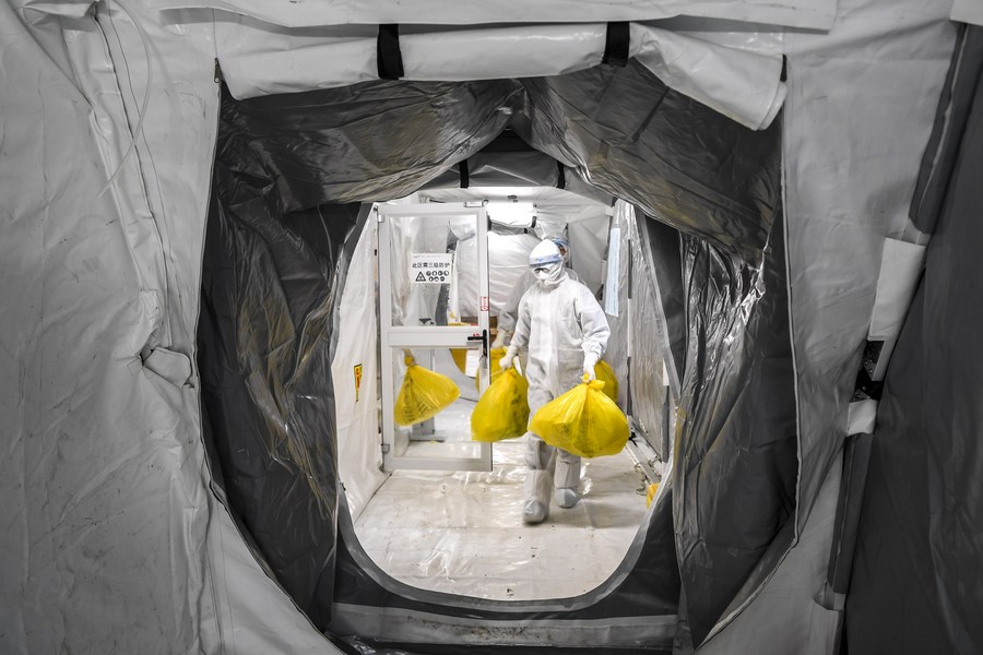 Medical workers transfer packages of medical waste in an air-inflated laboratory for COVID-19 nucleic acid testing in Debao County of Baise, south China's Guangxi Zhuang Autonomous Region, Feb. 13, 2022. In recent days, mobile laboratories and air-inflated laboratories have been put into use in order to improve the efficiency of COVID-19 nucleic acid testing in Debao County. (Xinhua/Cao Yiming)