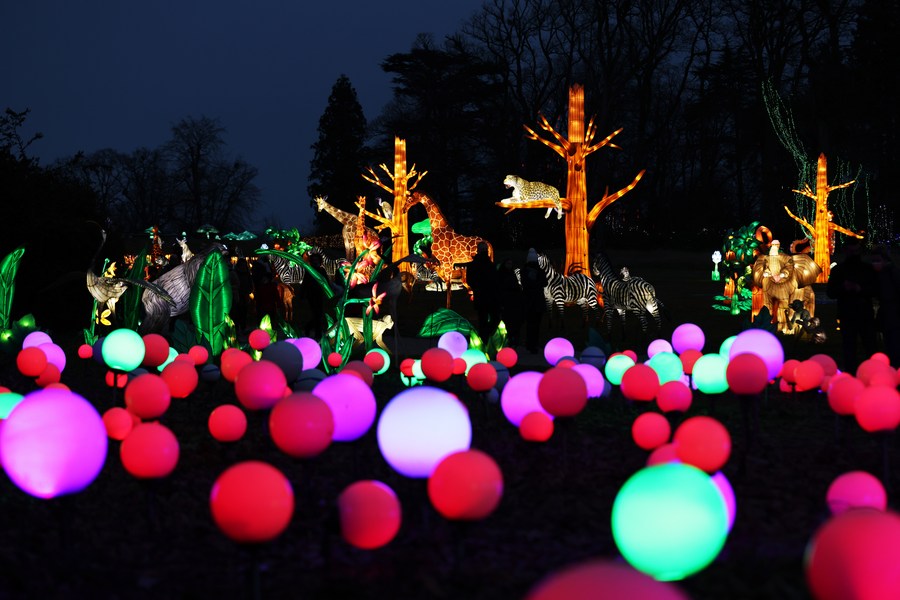 Illuminated sculptures are on display during a light festival at Thoiry zoo near Paris, France, Feb. 13, 2022. The festival runs till March 6, 2022. (Xinhua/Gao Jing)
