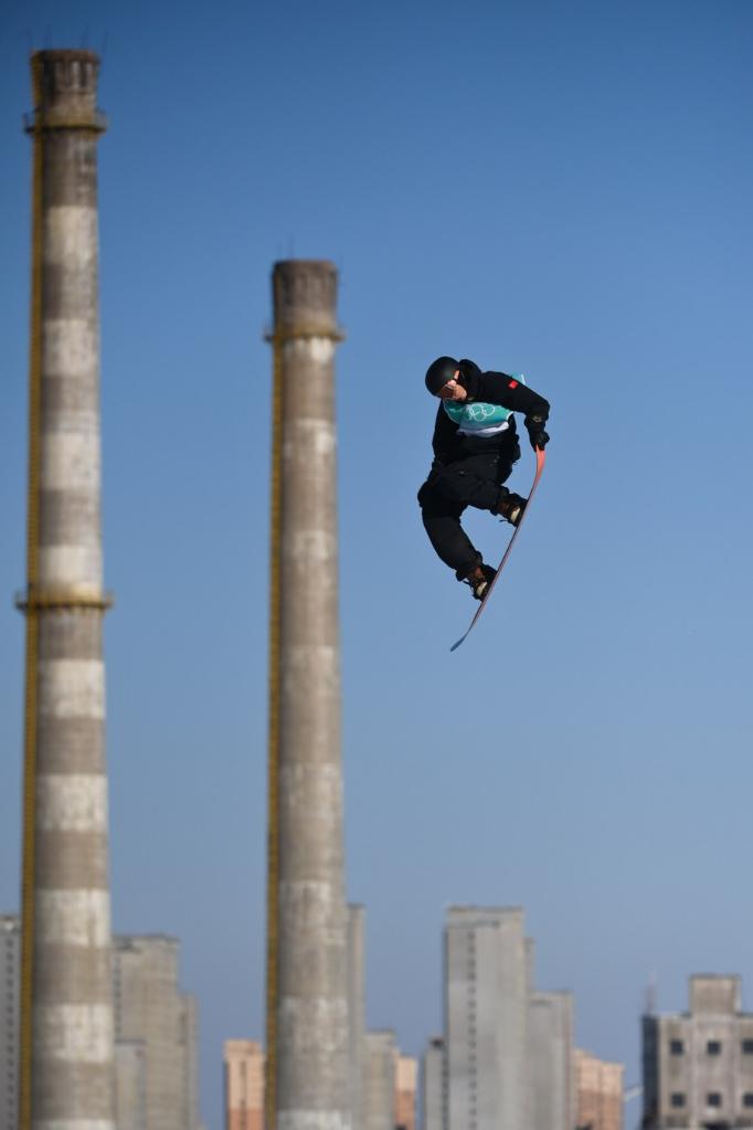Su Yiming of China competes during the men's snowboard big air qualification of Beijing 2022 Winter Olympics at Big Air Shougang in Beijing, capital of China, Feb. 14, 2022. (Xinhua/Xue Yuge)