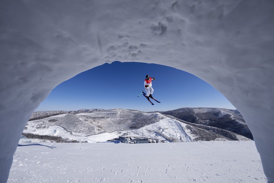Darian Stevens of the United States takes part in training before women's freeski slopestyle qualification of Beijing 2022 Winter Olympics at Genting Snow Park in Zhangjiakou, north China's Hebei Province, Feb. 14, 2022. (Xinhua/Fei Maohua)