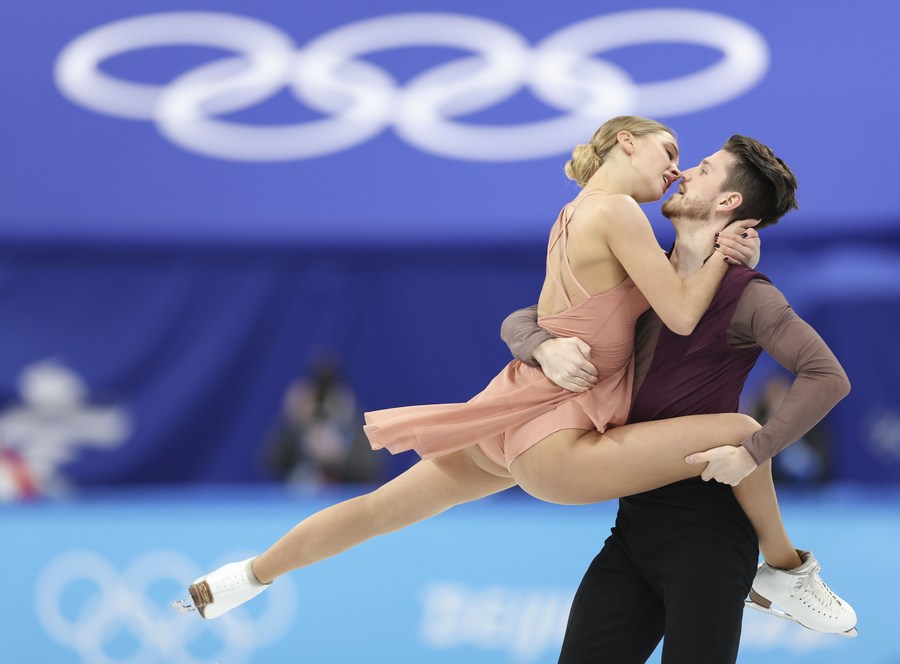 Alexandra Stepanova (L) and Ivan Bukin of ROC perform during the figure skating ice dance free dance match of Beijing 2022 Winter Olympics at Capital Indoor Stadium in Beijing, capital of China, Feb. 14, 2022. (Xinhua/Lan Hongguang)