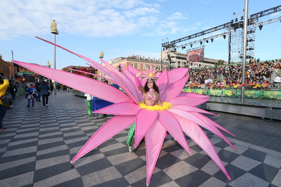Actors perform during the Battle of the Flowers parade of the 2022 Nice Carnival in Nice, France, Feb. 13, 2022. The carnival runs from Feb. 11 to 27 under the theme "King of Animals." (Photo by Serge Haouzi/ Xinhua)