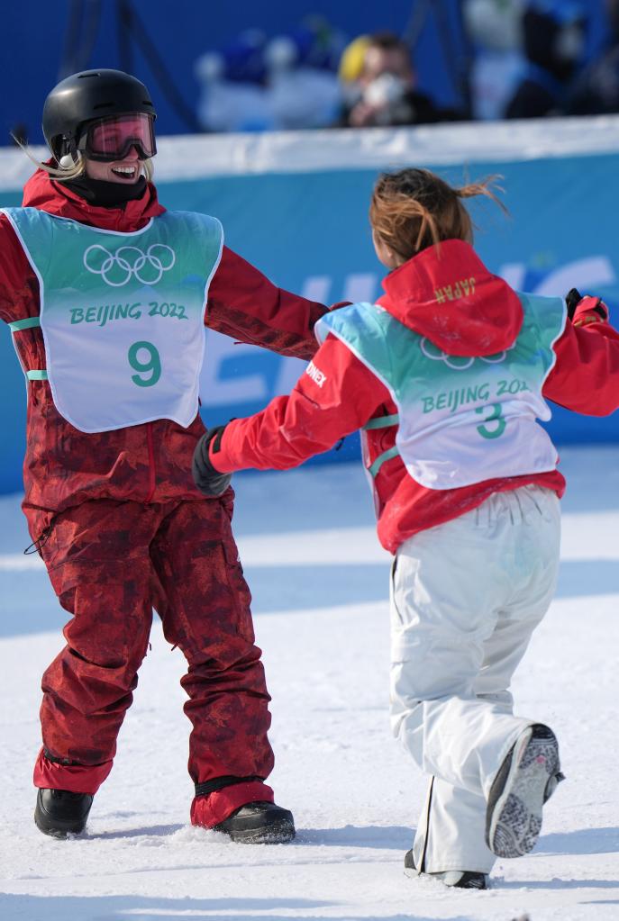 Laurie Blouin (rear) of Canada hugs Iwabuchi Reira of Japan during the women's snowboard big air final of Beijing 2022 Winter Olympics at Big Air Shougang in Beijing, capital of China, Feb. 15, 2022. (Xinhua/Li Yibo)