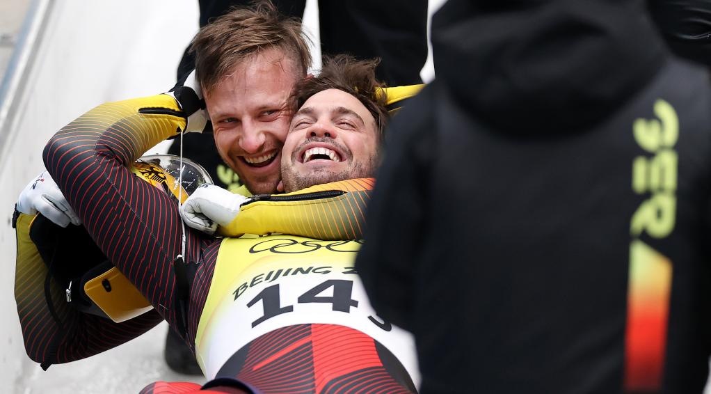 Tobias Wendl/Tobias Arlt of Germany celebrate after the luge team relay competition at the Yanqing National Sliding Centre in Yanqing district of Beijing, capital of China, Feb. 10, 2022. (Xinhua/Yao Jianfeng)