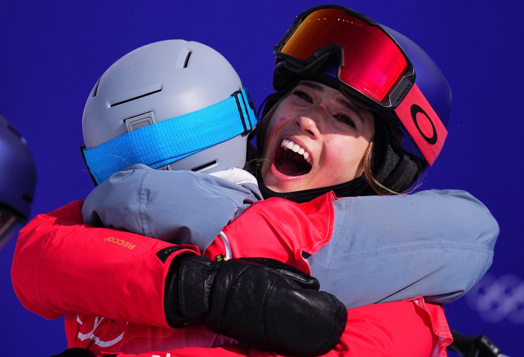 Gu Ailing (R) of China hugs Johanne Killi of Norway during the freestyle skiing women's freeski slopestyle final of Beijing 2022 Winter Olympics at Genting Snow Park in Zhangjiakou, north China's Hebei Province, Feb. 15, 2022. (Xinhua/Xu Chang)