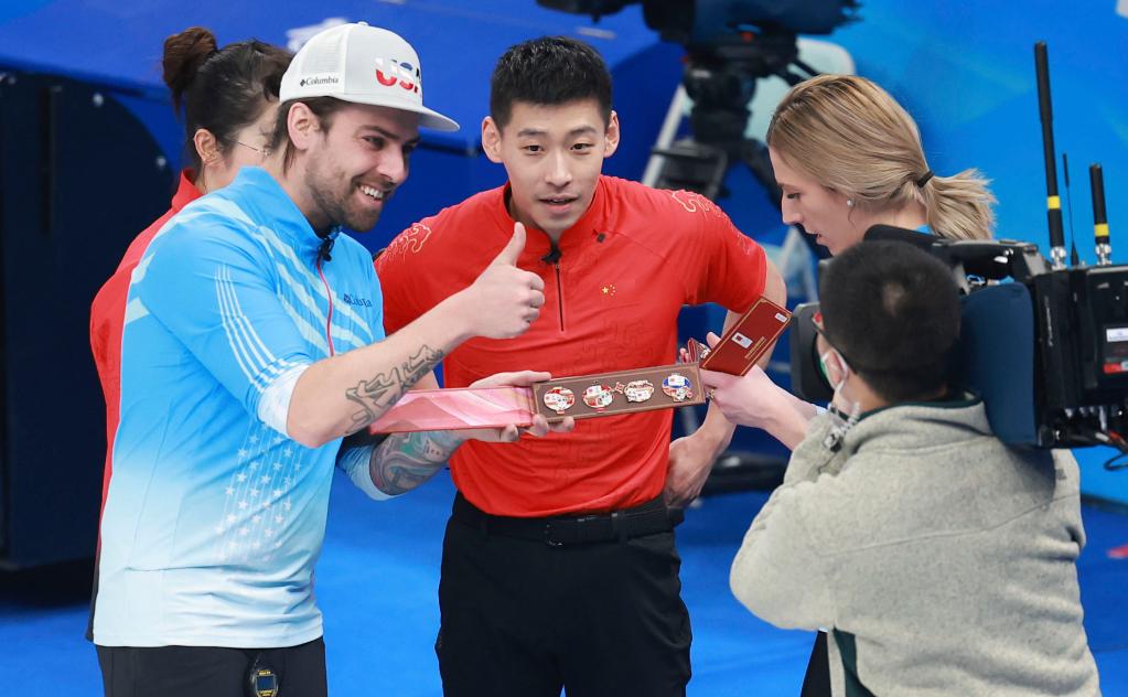 Christopher Plys (front) of the United States thumbs up after receiving gifts from China's athletes Fan Suyuan (1st L) and Ling Zhi (2nd R) after the curling mixed doubles round robin event of the Beijing 2022 Winter Olympics between China and the United States at National Aquatics Centre in Beijing, capital of China, Feb. 5, 2022. (Xinhua/Liu Xu)
