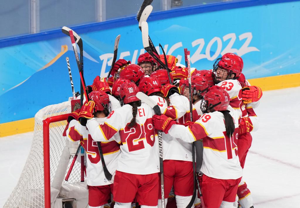 Athletes of China react during the ice hockey women's Group B match between China and Denmark at Wukesong Sports Centre in Beijing, capital of China, Feb. 4, 2022. (Xinhua/Meng Yongmin)