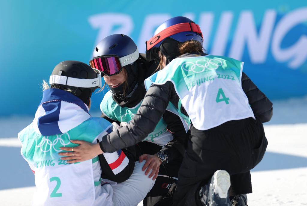Gu Ailing (R) of China and Mathilde Gremaud of Switzerland (C) comfort Tess Ledeux of France after women's freeski big air final at Big Air Shougang in Beijing, capital of China, Feb. 8, 2022. (Xinhua/Ding Xu)