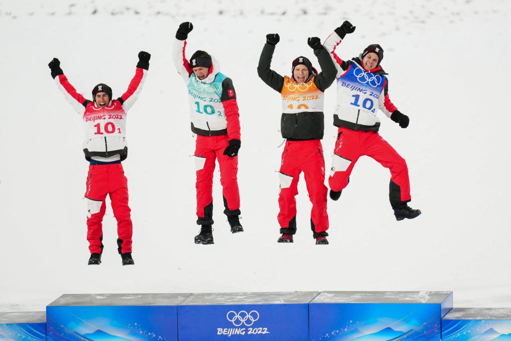 Gold medalists of Austria celebrate during the flower ceremony of ski jumping men's team at the National Ski Jumping Centre in Zhangjiakou, north China's Hebei Province, Feb. 14, 2022. (Xinhua/Zhu Zheng)