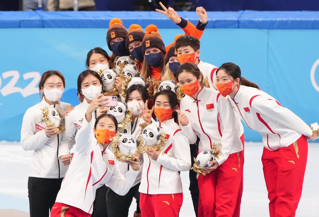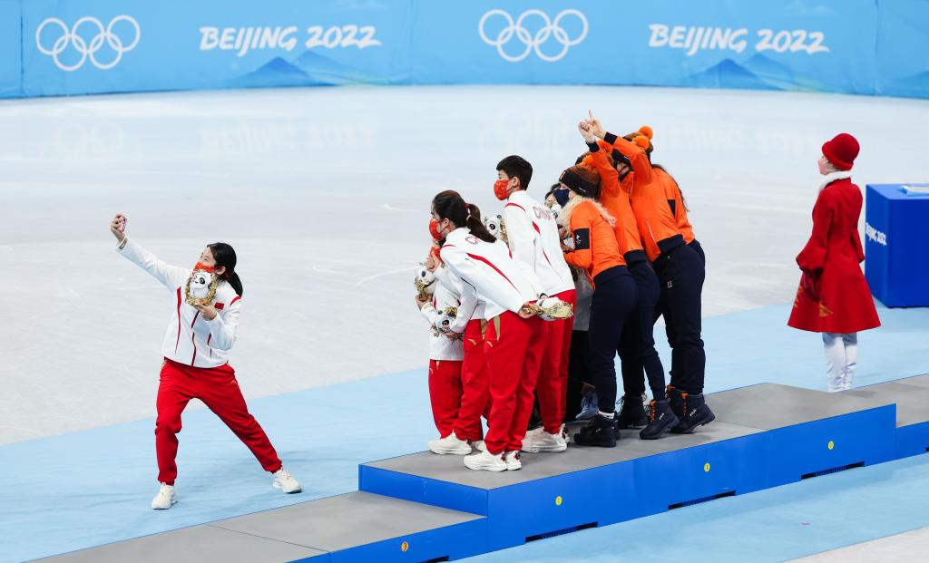 Medalists take a selfie during the flower ceremony of the women's 3,000m relay final of short track speed skating at Capital Indoor Stadium in Beijing, capital of China, Feb. 13, 2022. (Xinhua/Wang Yuguo)