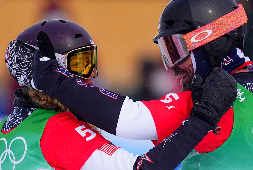 Lindsey Jacobellis (L) and Nick Baumgartner of the United States react after the mixed team snowboard cross finals at Genting Snow Park in Zhangjiakou, north China's Hebei Province, Feb. 12, 2022. (Xinhua/Xu Chang)