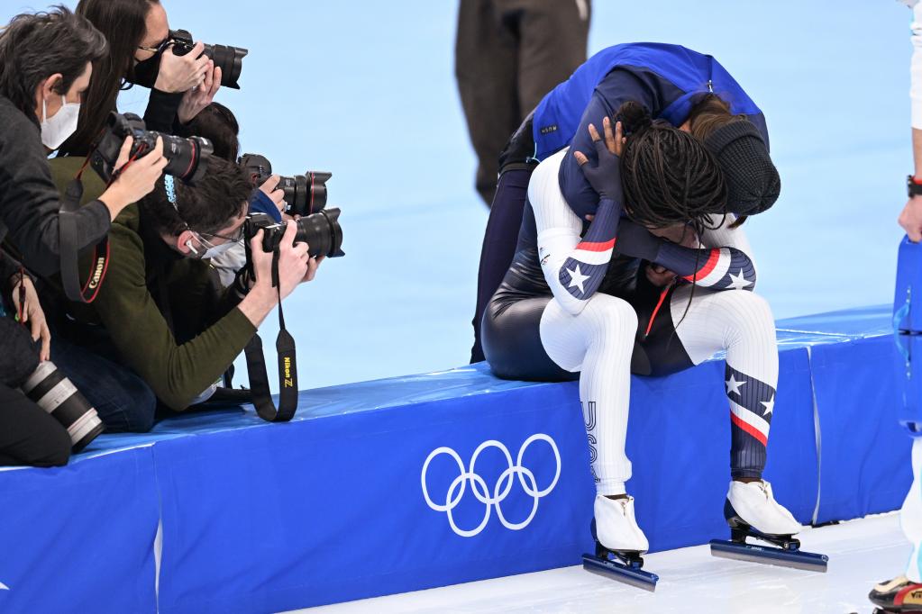 Erin Jackson (R, front) of the United States hugs teammate Brittany Bowe after winning speed skating women's 500m at the National Speed Skating Oval in Beijing, capital of China, Feb. 13, 2022. (Xinhua/Wu Wei)