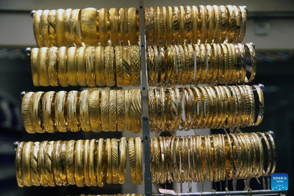 Gold products are seen at a jewelry store in Ankara, Turkey, on Feb. 14, 2022. (Photo by Mustafa Kaya/Xinhua)