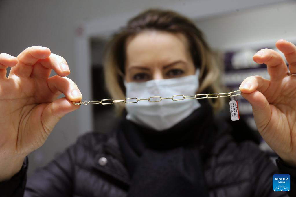 A customer displays a gold product at a jewelry store in Ankara, Turkey, on Feb. 14, 2022. (Photo by Mustafa Kaya/Xinhua)