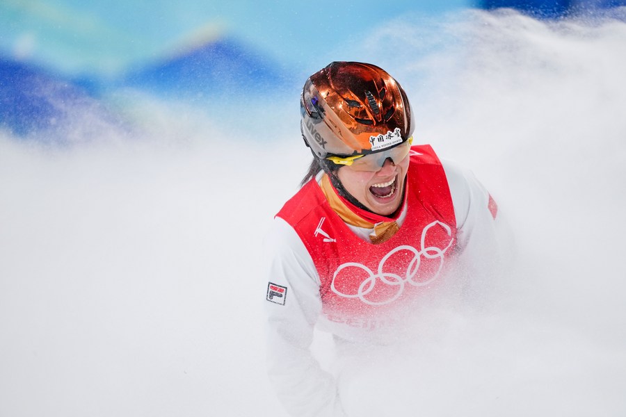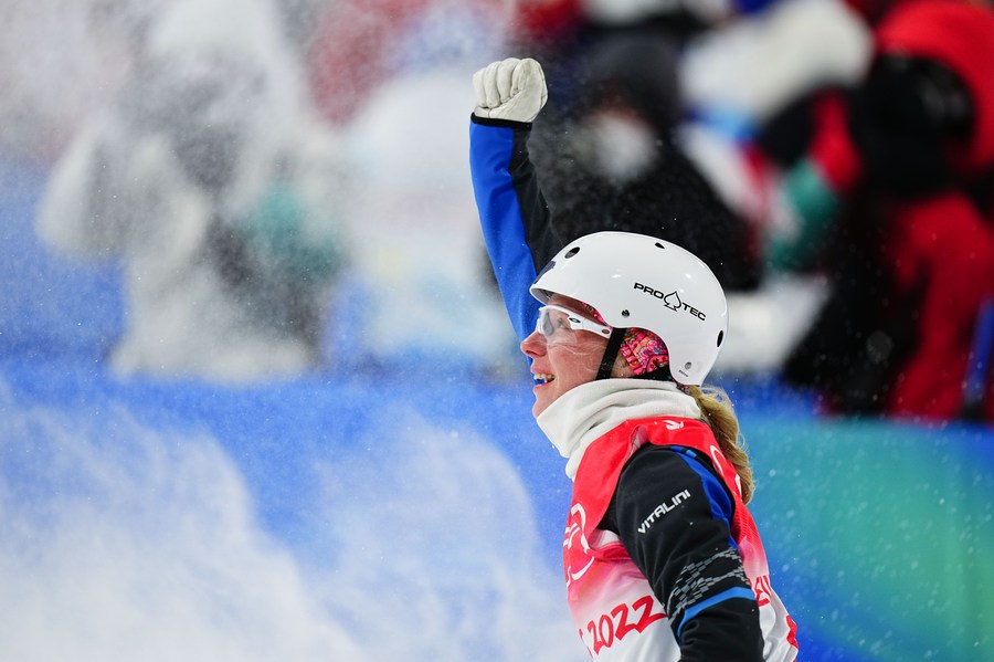 Hanna Huskova of Belarus reacts during the freestyle skiing women's aerials final of Beijing 2022 Winter Olympics at Genting Snow Park in Zhangjiakou, north China's Hebei Province, Feb. 14, 2022. (Xinhua/Xu Chang)
