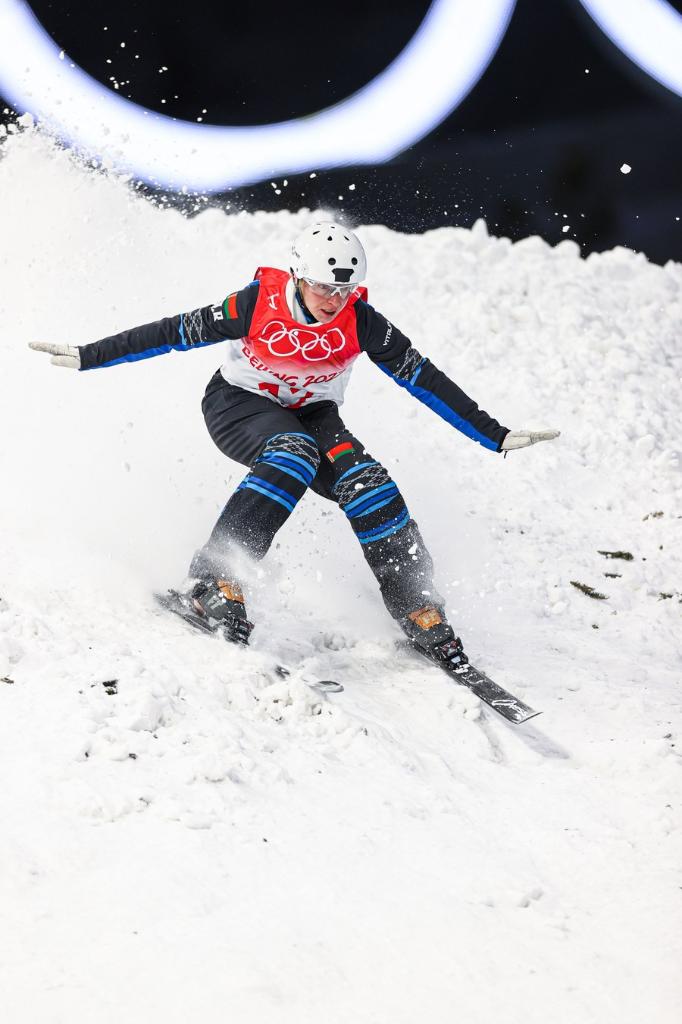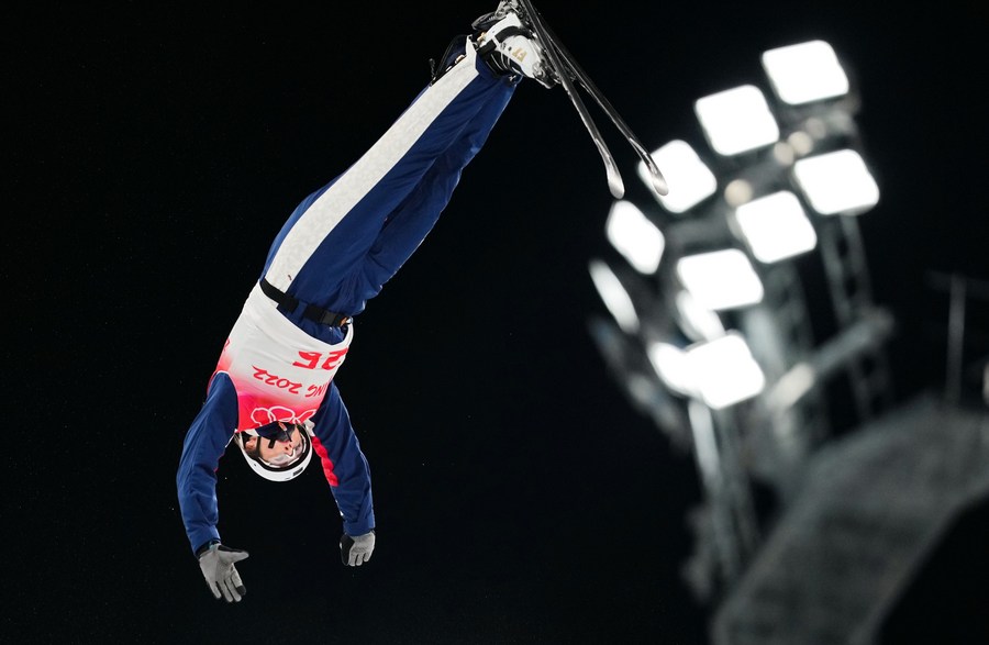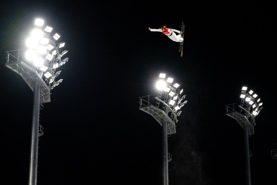 Hanna Huskova of Belarus competes during the freestyle skiing women's aerials final of the Beijing 2022 Winter Olympics at Genting Snow Park in Zhangjiakou, north China's Hebei Province, Feb. 14, 2022. (Xinhua/Yang Shiyao)