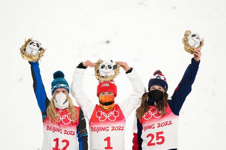 Xu Mengtao (C) of China, Hanna Huskova (L) of Belarus and Megan Nick of the United States attend the flower ceremony after the freestyle skiing women's aerials final of Beijing 2022 Winter Olympics at Genting Snow Park in Zhangjiakou, north China's Hebei Province, Feb. 14, 2022. (Xinhua/Xue Yubin)