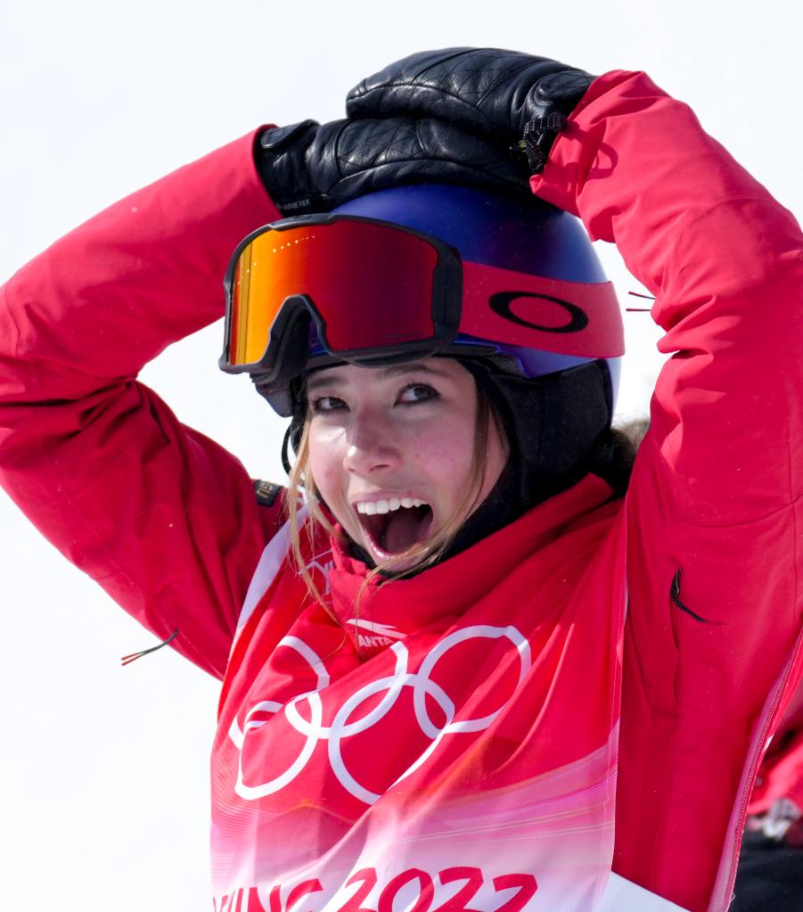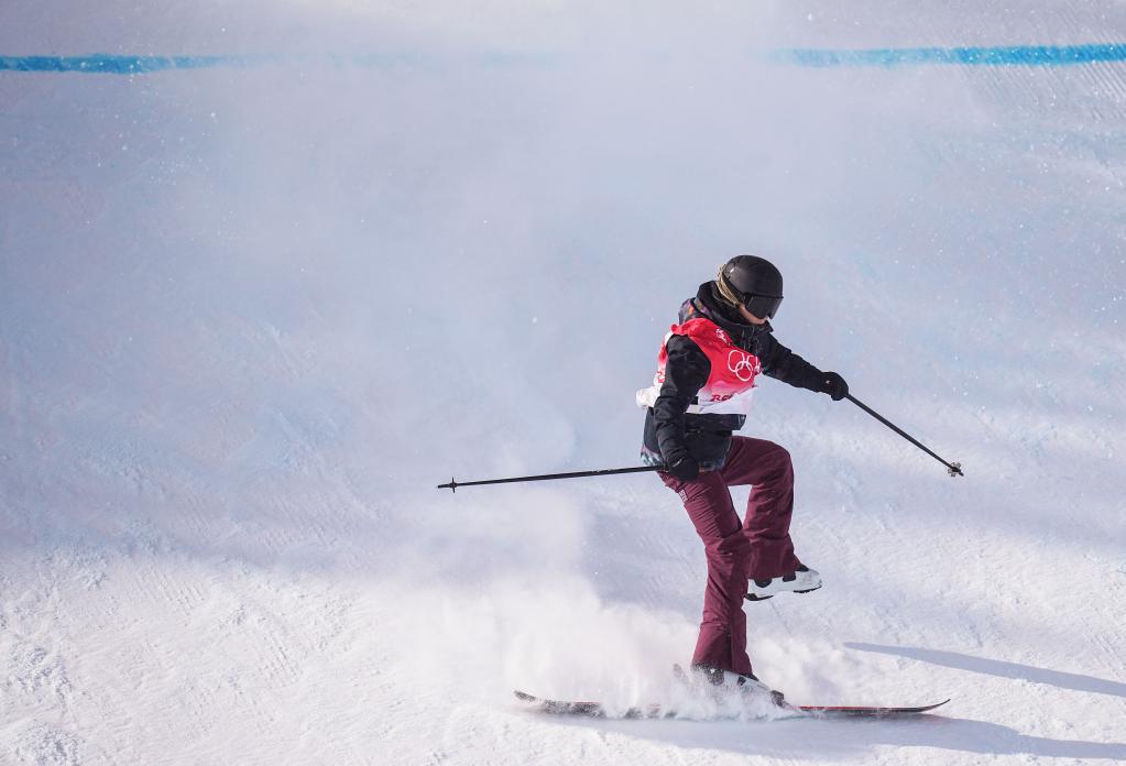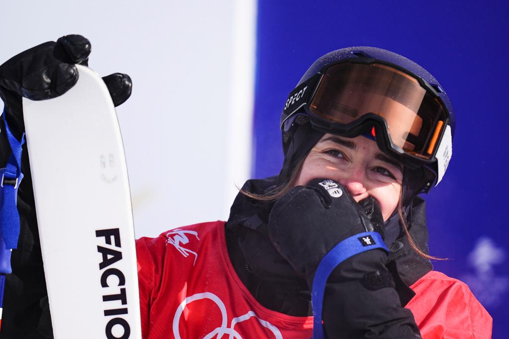 Mathilde Gremaud of Switzerland reacts during the freestyle skiing women's freeski slopestyle final of Beijing 2022 Winter Olympics at Genting Snow Park in Zhangjiakou, north China's Hebei Province, Feb. 15, 2022. (Xinhua/Xu Chang)