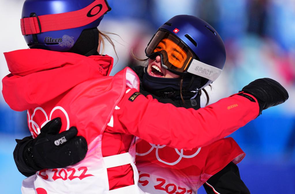 Mathilde Gremaud (R) of Switzerland hugs Gu Ailing of China during the freestyle skiing women's freeski slopestyle final of Beijing 2022 Winter Olympics at Genting Snow Park in Zhangjiakou, north China's Hebei Province, Feb. 15, 2022. (Xinhua/Xu Chang)
