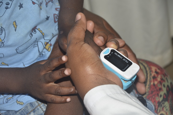 A doctor checks the condition of a child patient with cancer by using a pulse oximeter at Mulago National Referral Hospital in Kampala, Uganda, Feb. 14, 2022. (Photo by Nicholas Kajoba/Xinhua)