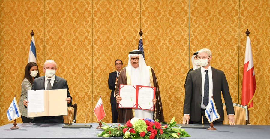 Photo shows Israeli National Security Adviser Meir Ben-Shabbat (L), Bahraini Foreign Minister Abdullatif Al Zayani (C) and Israeli Foreign Ministry Director-General Alon Ushpiz (R) at the signing ceremony of a series of agreements between Israel and Bahrain, in Manama, capital of Bahrain, on Oct. 18, 2020. (Photo from Bahrain News Agency)