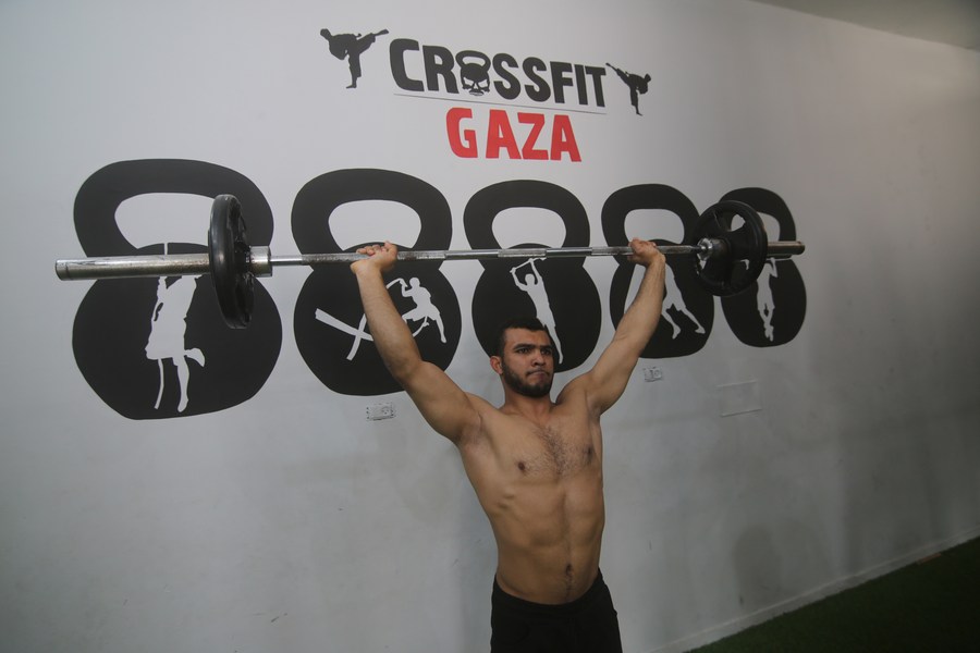 A Palestinian young man is seen working out at a CrossFit gym in the southern Gaza Strip city of Rafah, on Feb. 9, 2022. (Photo by Khaled Omar/Xinhua)