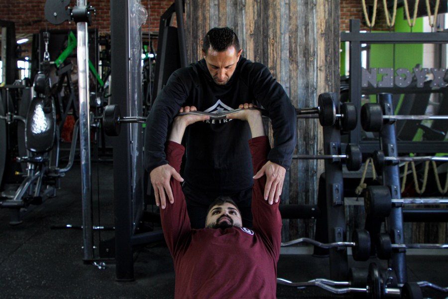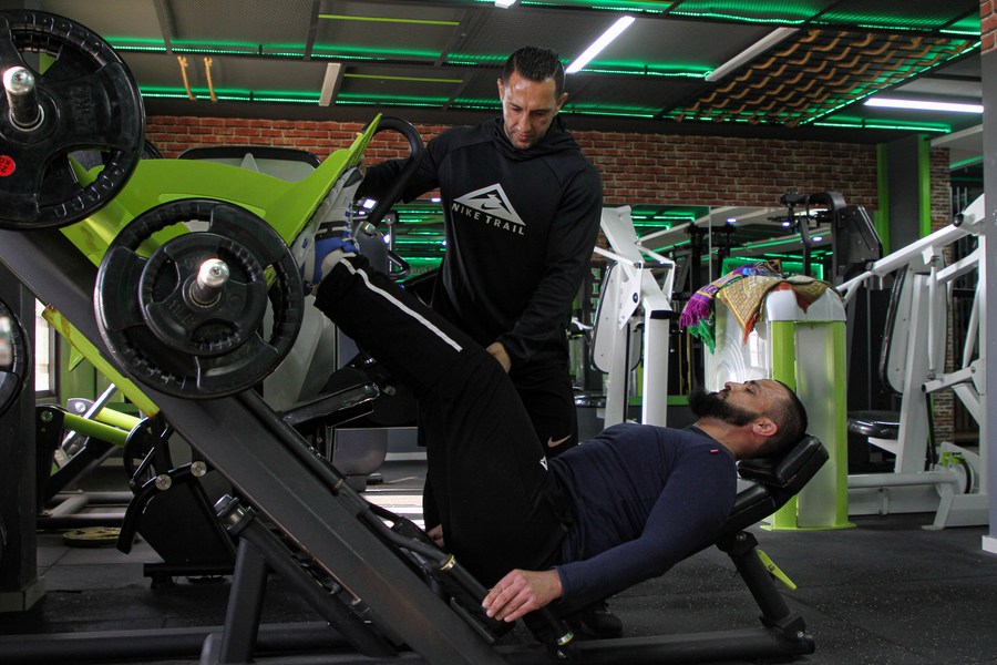 A Gazan coach training a young man on playing bodybuilding at a local gym, on Feb. 15, 2021. (Photo by Rizek Abdeljawad/Xinhua)