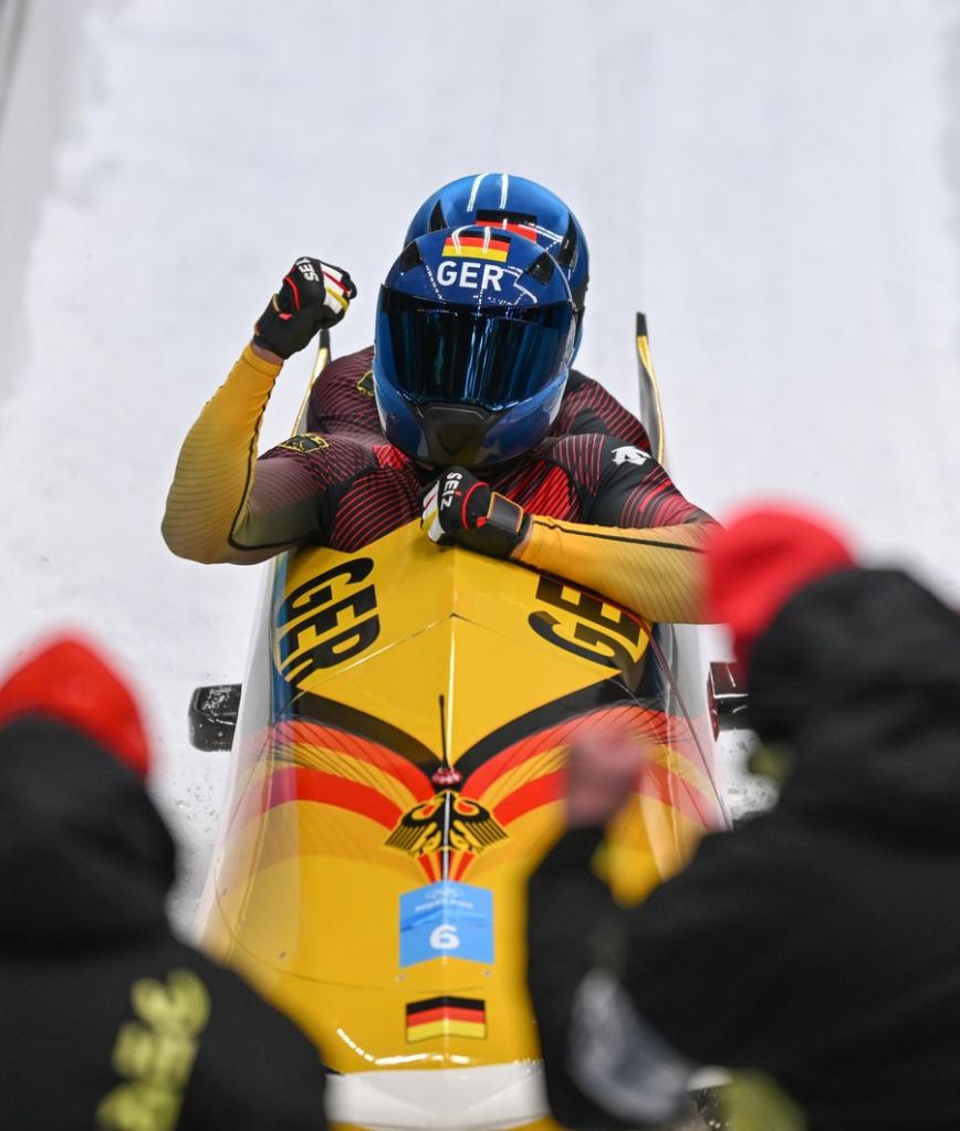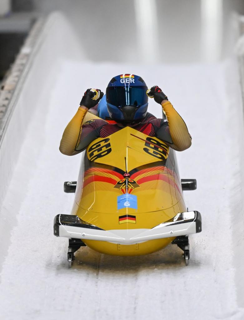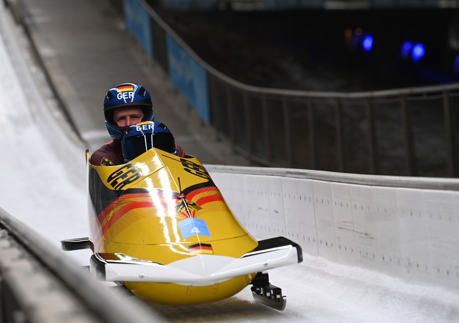 Francesco Friedrich/Thorsten Margis compete during the bobsleigh 2-man heat of Beijing 2022 Winter Olympics at National Sliding Centre in Yanqing District, Beijing, capital of China, Feb. 15, 2022. (Xinhua/Sun Fei)