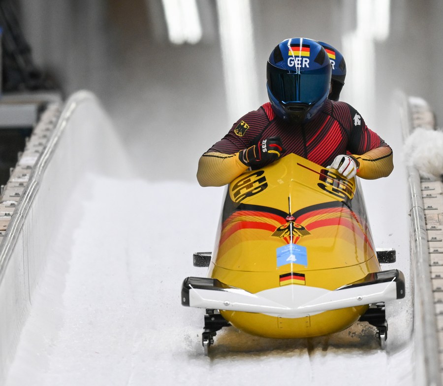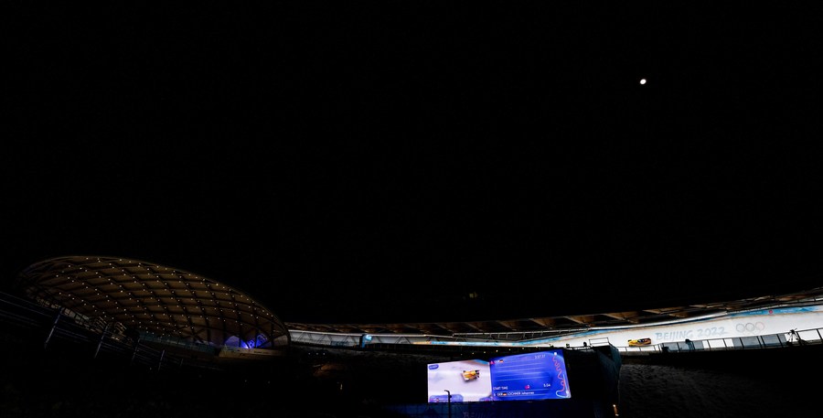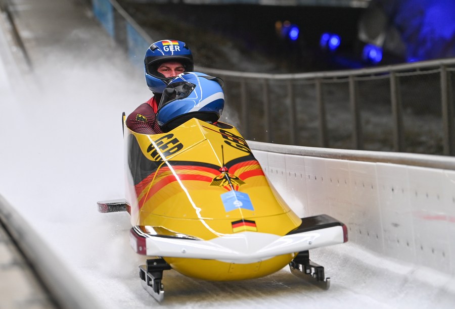 Johannes Lochner/Florian Bauer of Germany compete during the bobsleigh 2-man heat of Beijing 2022 Winter Olympics at National Sliding Centre in Yanqing District, Beijing, capital of China, Feb. 15, 2022. (Xinhua/Jiang Wenyao)