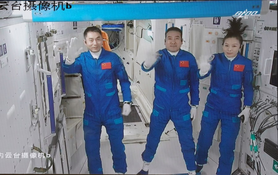 Screen image captured at Beijing Aerospace Control Center in Beijing, capital of China, Oct. 16, 2021 shows three Chinese astronauts, Zhai Zhigang (C), Wang Yaping (R) and Ye Guangfu, waving after entering the space station core module Tianhe. (Xinhua/Tian Dingyu)