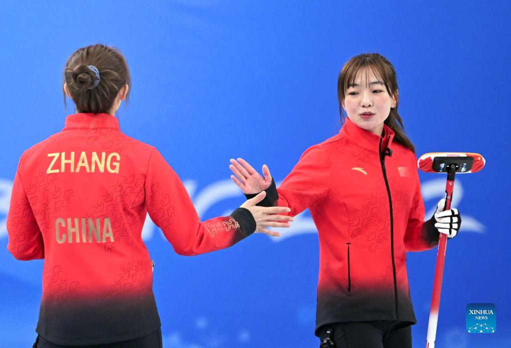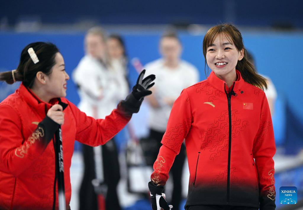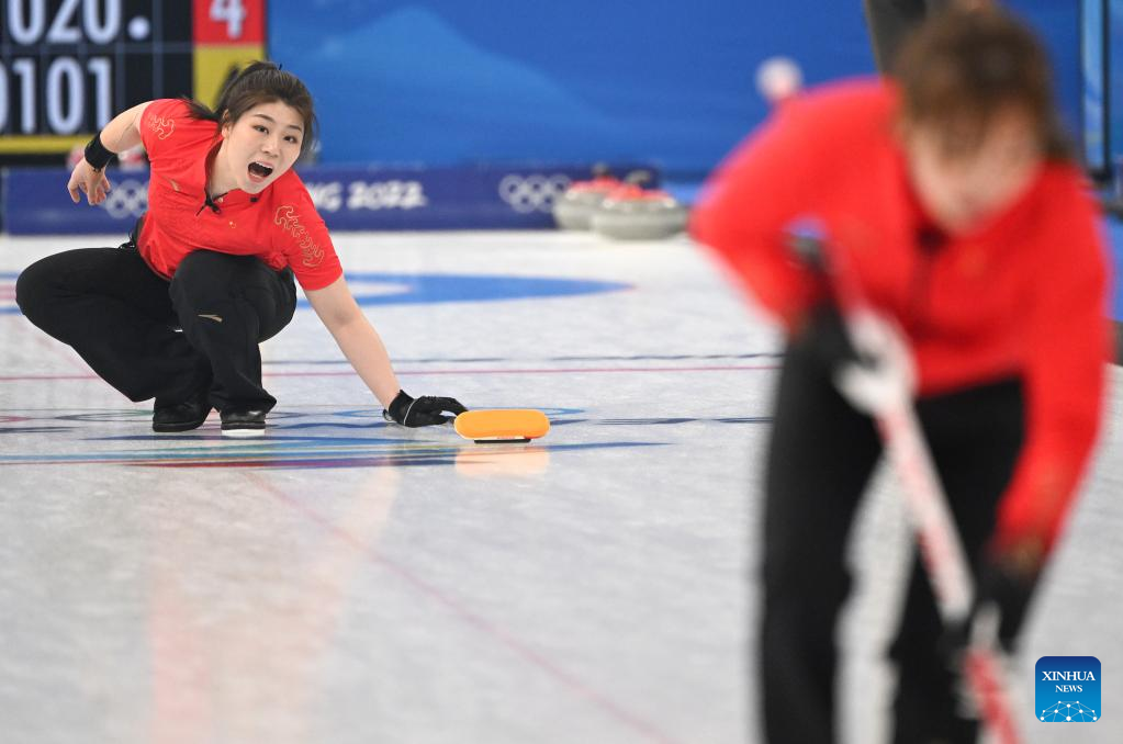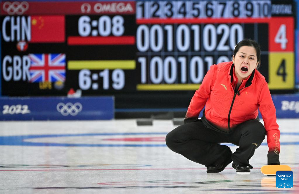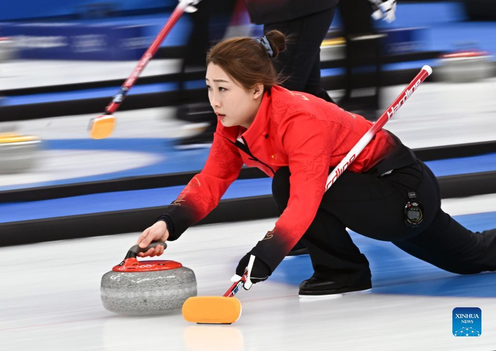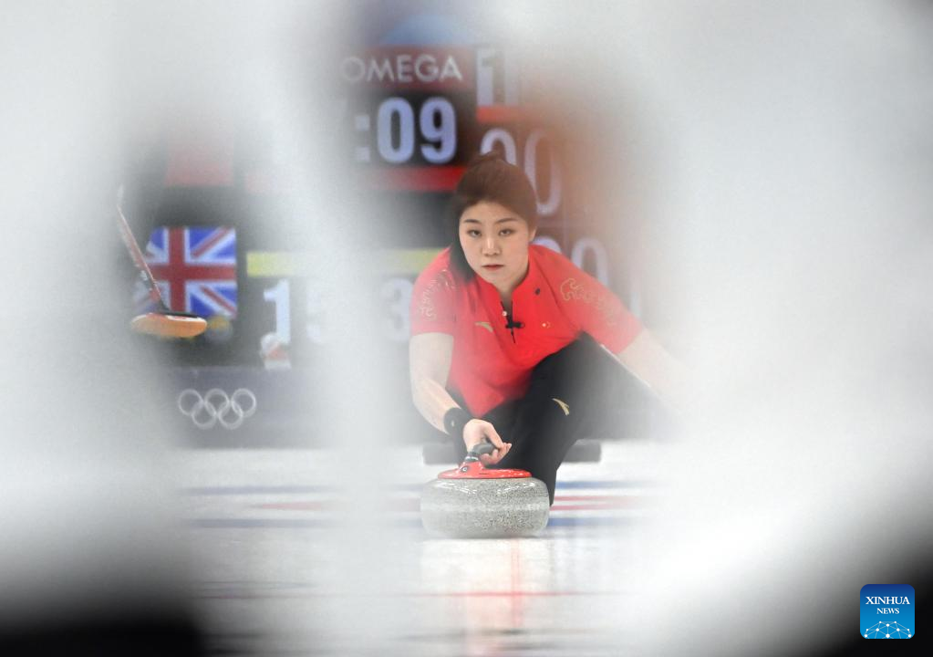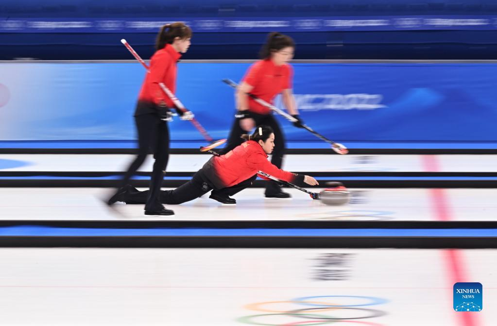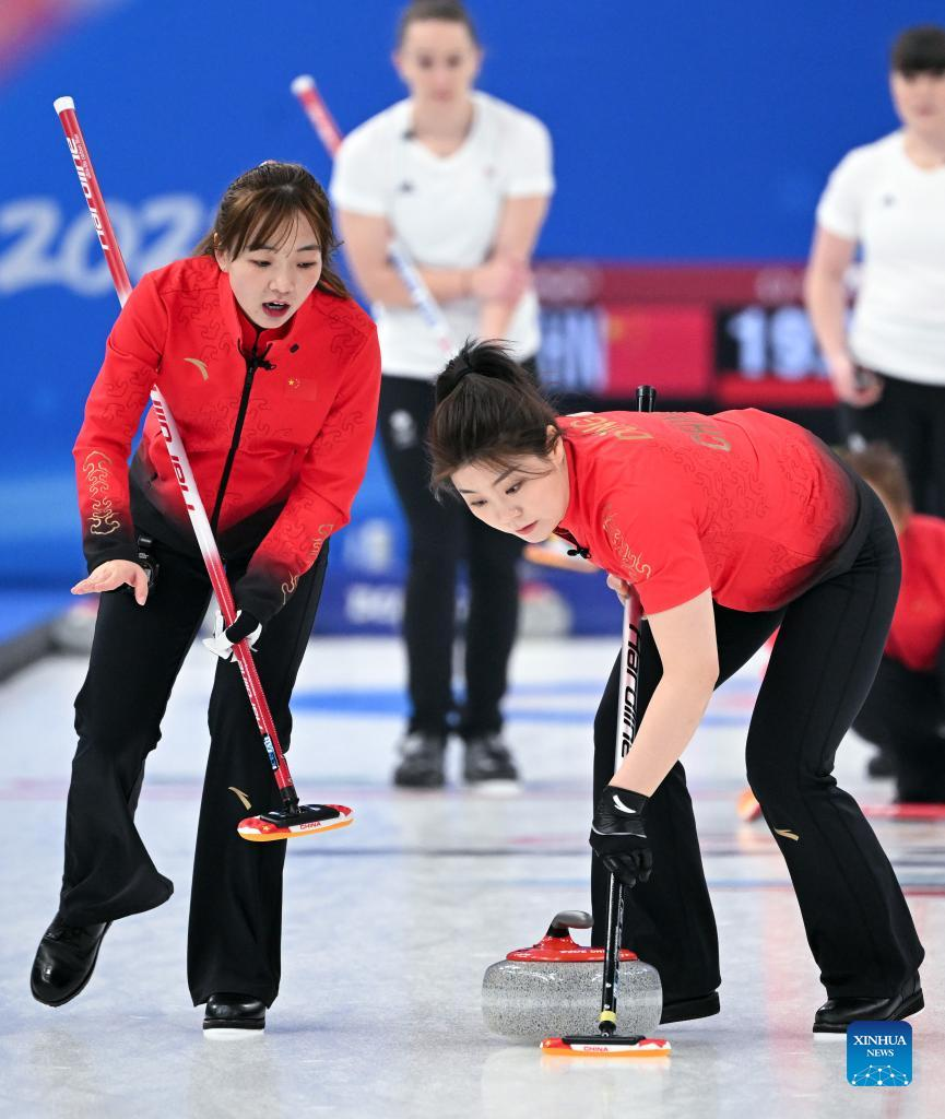 Athletes of China compete during the curling women's round robin session 10 of Beijing 2022 Winter Olympics between China and Great Britain at National Aquatics Centre in Beijing, capital of China, Feb. 16, 2022. (Xinhua/Li He)