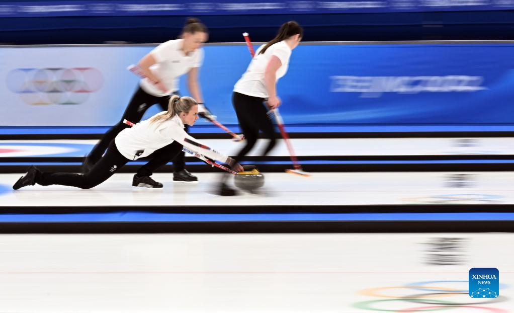 Athletes of Great Britain compete during the curling women's round robin session 10 of Beijing 2022 Winter Olympics between China and Great Britain at National Aquatics Centre in Beijing, capital of China, Feb. 16, 2022. (Xinhua/Li He)