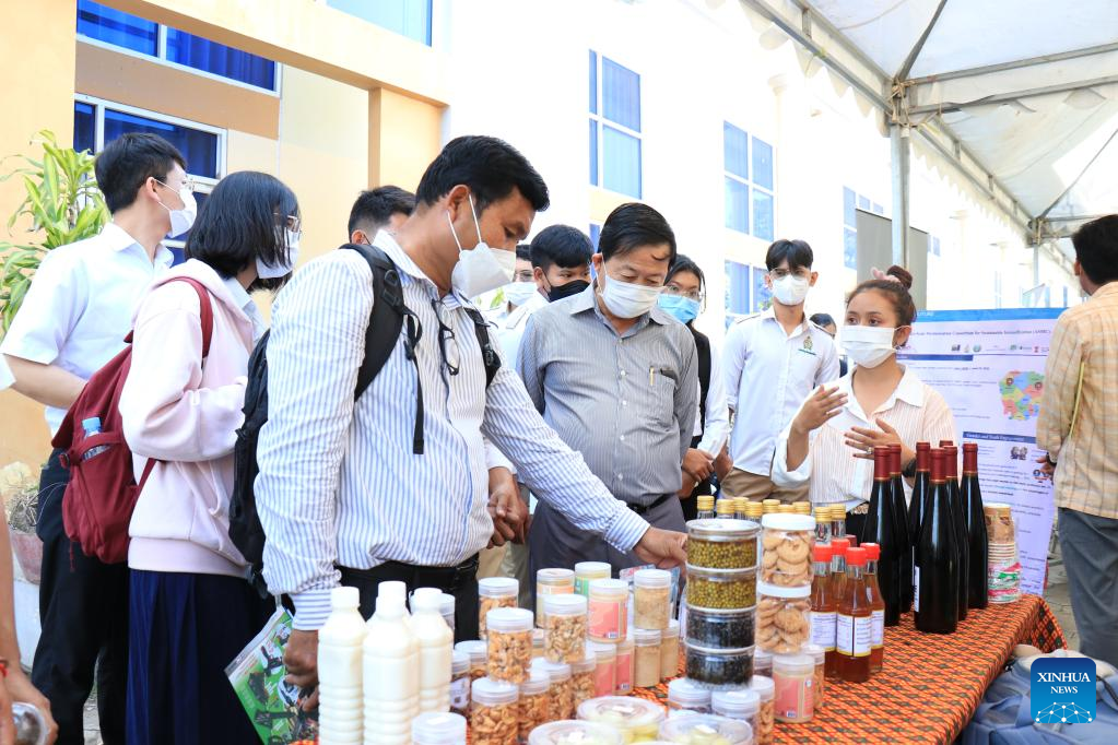 People visit an agricultural market and innovation fair at the Royal University of Agriculture in Phnom Penh, Cambodia on Feb. 15, 2022. Cambodia's Ministry of Agriculture, Forestry and Fisheries (MAFF) and the Food and Agriculture Organization of the United Nations (FAO) said on Wednesday that agricultural innovations hold key to sustainable production intensification and increasing farmers' income.(FAO/Handout via Xinhua)