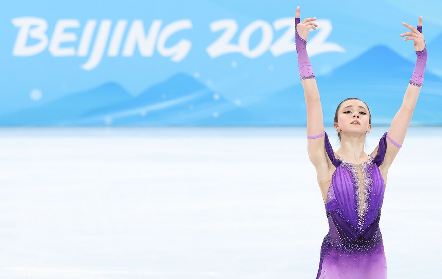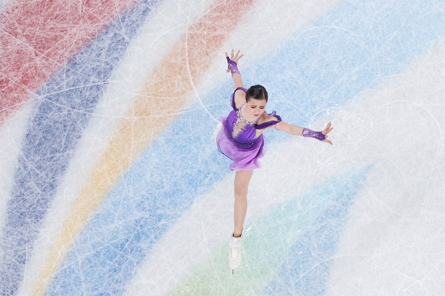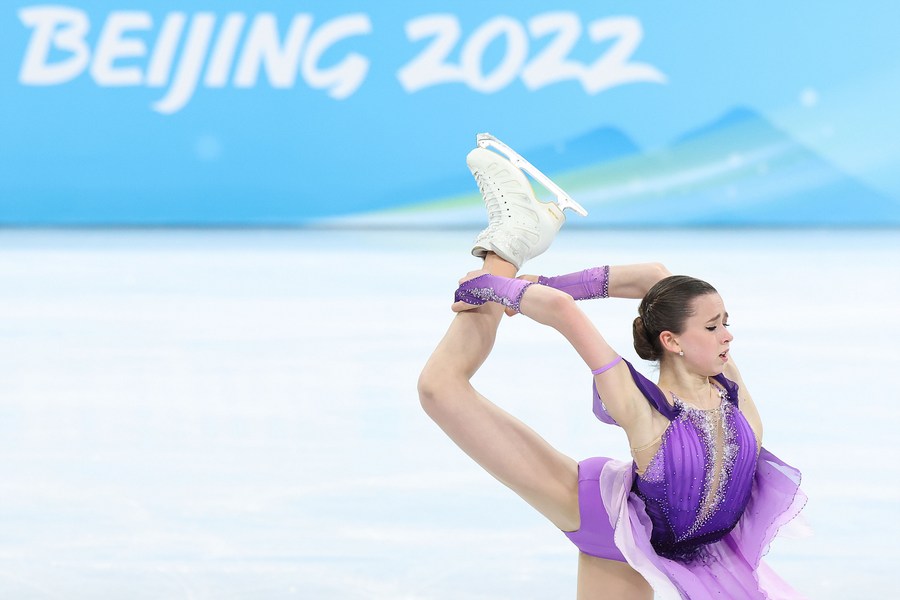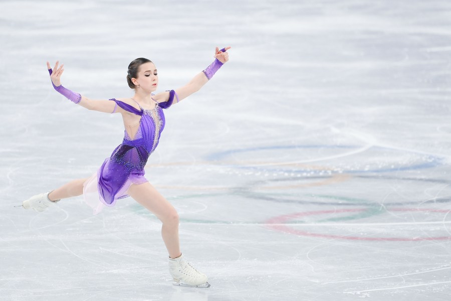 Kamila Valieva of ROC performs during the figure skating women single skating short program at Capital Indoor Stadium in Beijing, capital of China, Feb. 15, 2022. (Xinhua/Xue Yuge)
