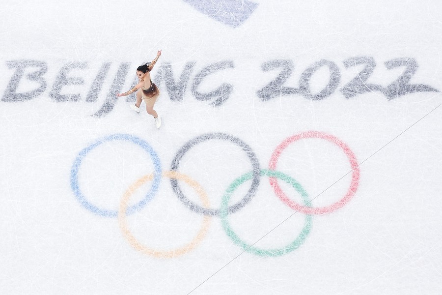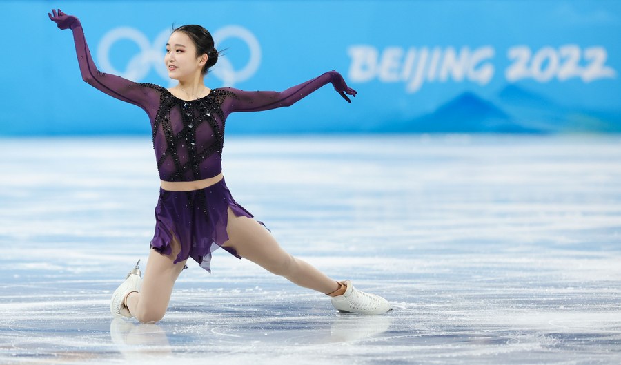 Sakamoto Kaori of Japan performs during the figure skating women single skating short program at Capital Indoor Stadium in Beijing, capital of China, Feb. 15, 2022. (Xinhua/Xu Zijian)