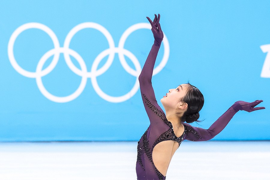 Anna Shcherbakova of ROC performs during the figure skating women single skating short program at Capital Indoor Stadium in Beijing, capital of China, Feb. 15, 2022. (Xinhua/Xue Yuge)