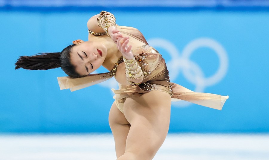 Sakamoto Kaori of Japan performs during the figure skating women single skating short program at Capital Indoor Stadium in Beijing, capital of China, Feb. 15, 2022. (Xinhua/Zhang Yuwei)