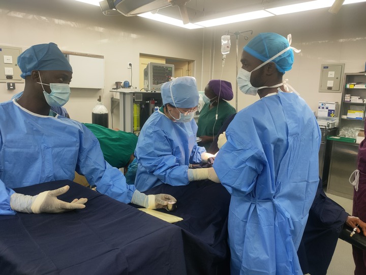 A Chinese doctor and her Ghanaian counterparts perform a cesarean section operation at China-Sierra Leone Friendship Hospital in Freetown, capital of Sierra Leone, Feb. 13, 2022. (Xinhua)