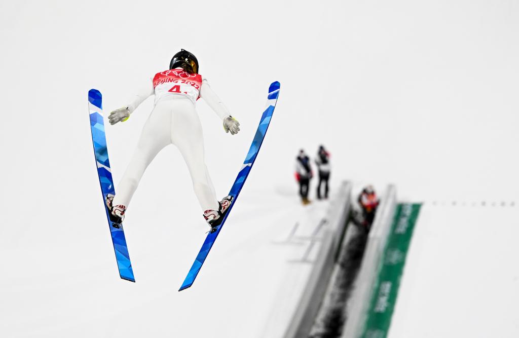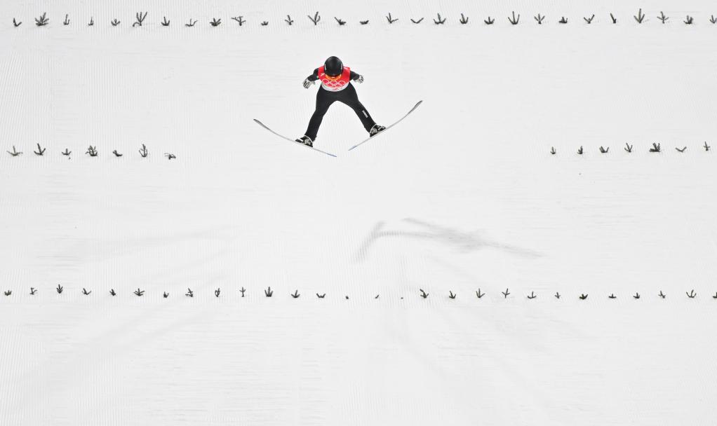 Irma Makhinia of ROC competes during Ski Jumping Mixed Team 1st Round at the National Ski Jumping Centre in Zhangjiakou, north China's Hebei Province, Feb. 7, 2022. (Xinhua/Feng Kaihua)