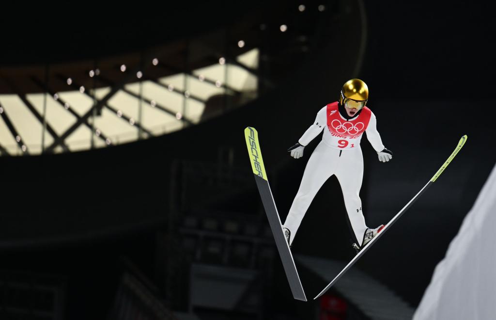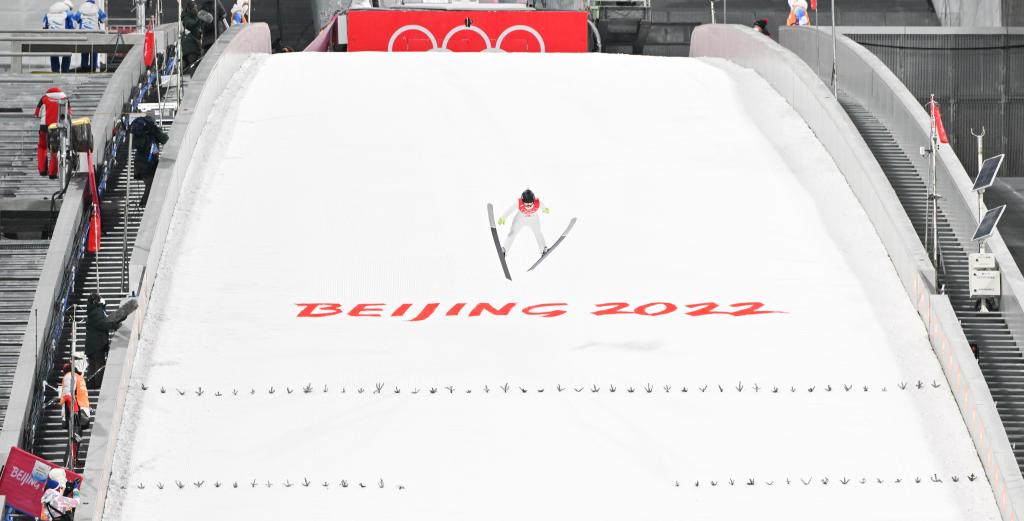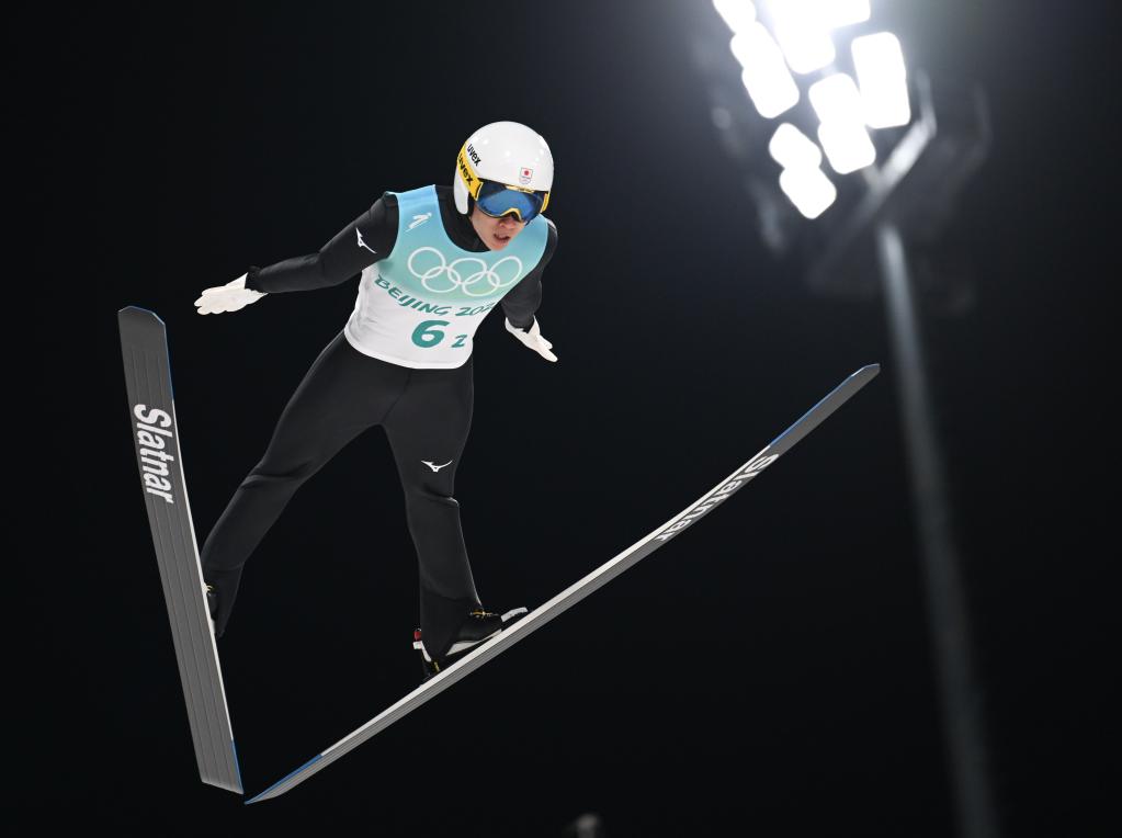 Sato Yukiya of Japan competes during Ski Jumping Mixed Team 1st Round at the National Ski Jumping Centre in Zhangjiakou, north China's Hebei Province, Feb. 7, 2022. (Xinhua/Mu Yu)