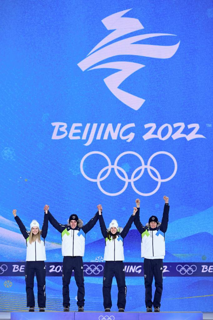 Gold medalists of team Slovenia pose for a photo during the awarding ceremony of the Ski Jumping Mixed Team at the Zhangjiakou Medals Plaza of the Winter Olympics in Zhangjiakou, north China's Hebei Province, Feb. 8, 2022. (Xinhua/Dai Tianfang)
