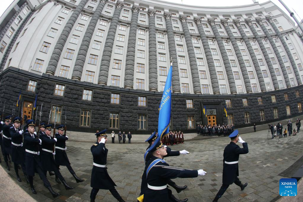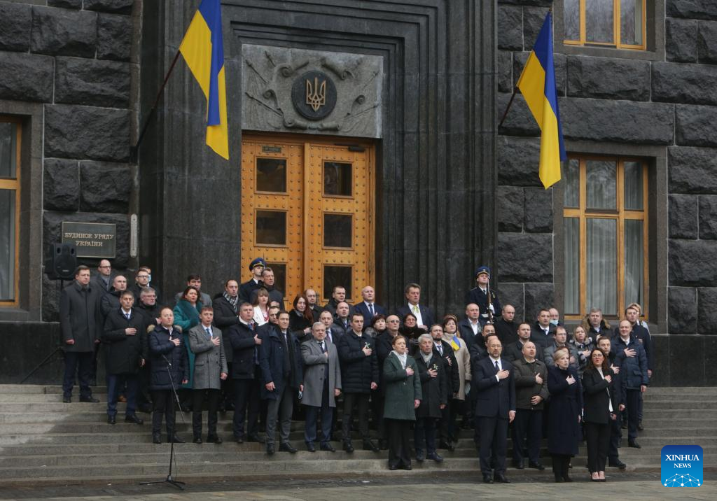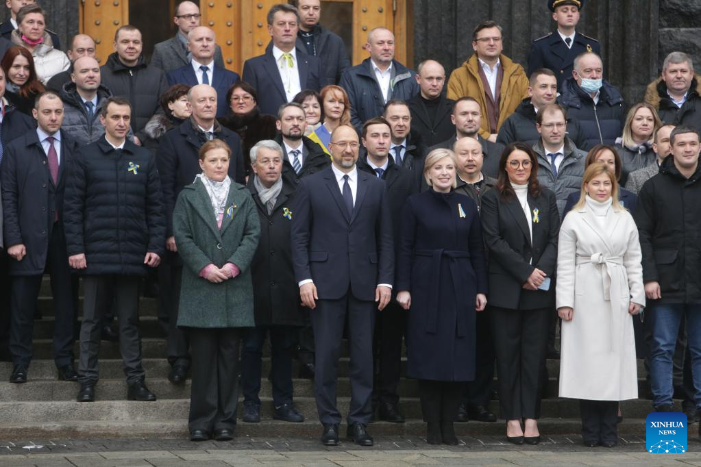 Members of the Ukrainian cabinet attend a Day of Unity celebration in front of the government office building in Kiev, Ukraine, Feb. 16, 2022. Ukraine on Wednesday celebrated the national Day of Unity to consolidate people amid the crisis in the country. (Photo by Sergey Starostenko/Xinhua)