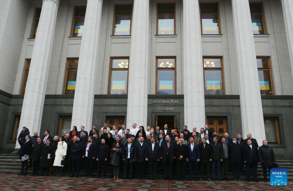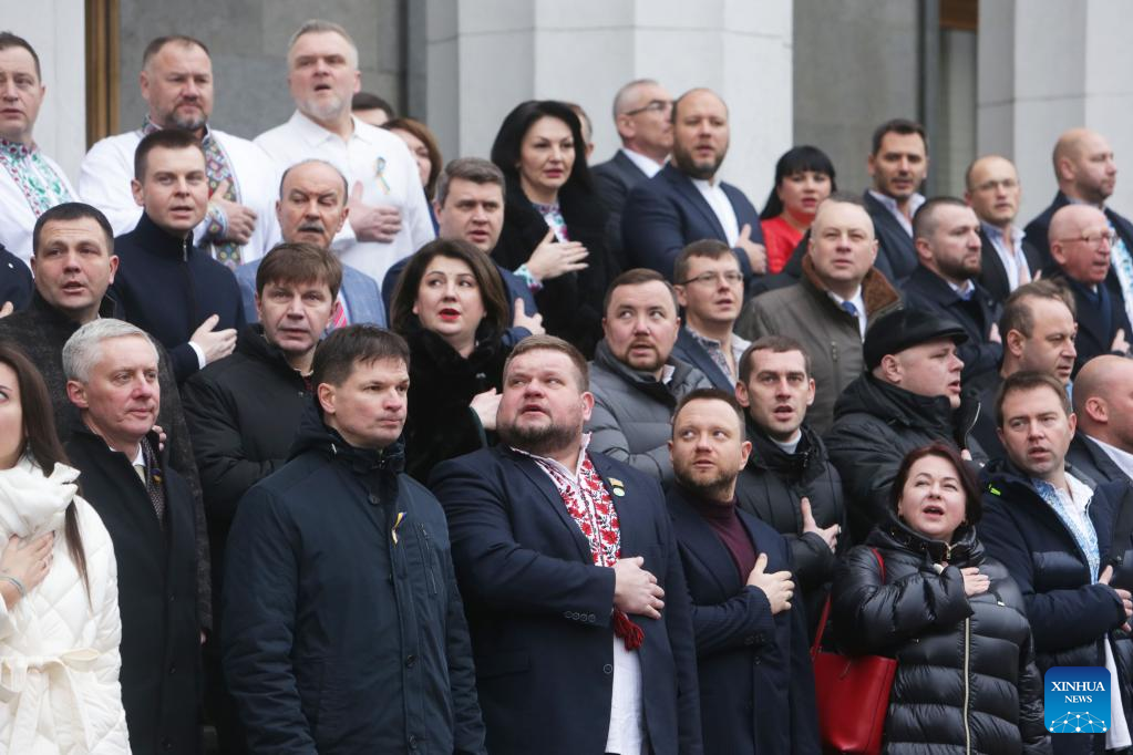 Members of the Ukrainian parliament sing the national anthem during a Day of Unity celebration outside the parliament building in Kiev, Ukraine, Feb. 16, 2022. Ukraine on Wednesday celebrated the national Day of Unity to consolidate people amid the crisis in the country. (Photo by Sergey Starostenko/Xinhua)
