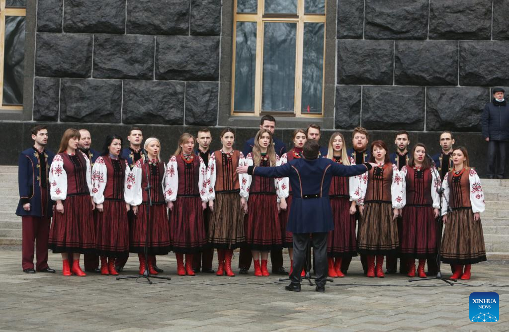Members of a chorus in traditional attire sing the national anthem during a Day of Unity celebration in Kiev, Ukraine, Feb. 16, 2022. Ukraine on Wednesday celebrated the national Day of Unity to consolidate people amid the crisis in the country. (Photo by Sergey Starostenko/Xinhua)