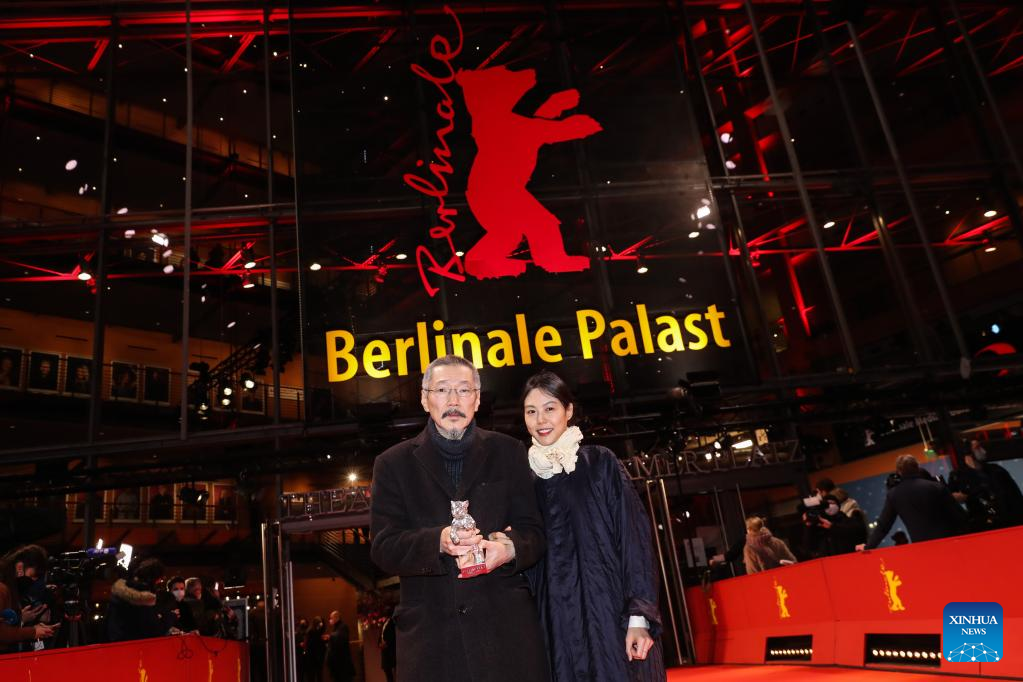 Director and screenwriter Hong Sang-soo (L) and actress Kim Min-hee of the film "The Novelist's Film" pose for photos after receiving the Silver Bear Grand Jury Prize during the 72nd Berlin International Film Festival in Berlin, capital of Germany, Feb. 16, 2022. (Xinhua/Shan Yuqi)