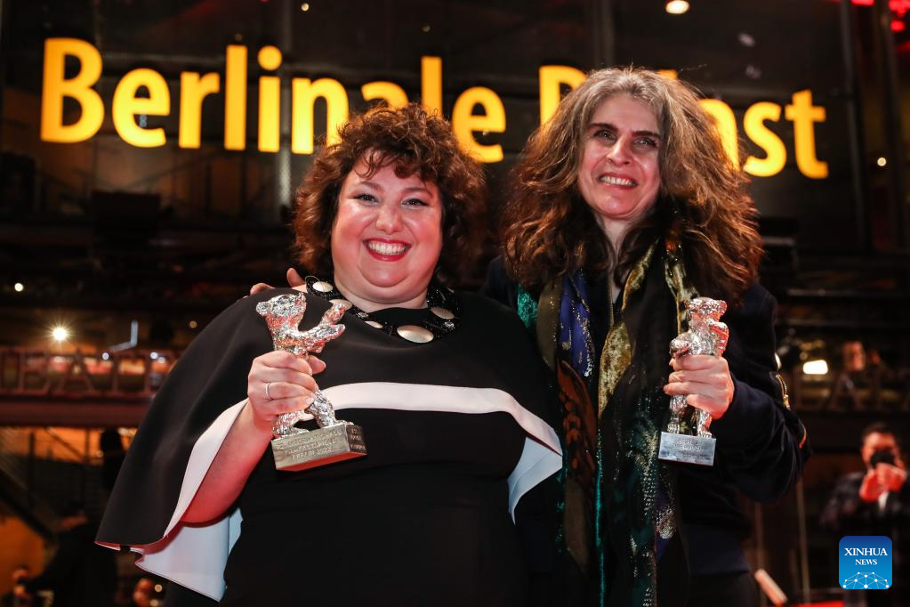 Actress Meltem Kaptan (L), winner of the Silver Bear for Best Lead Performance, and screenwriter Laila Stieler, winner of the Silver Bear for Best Screenplay, of the film "Rabiye Kurnaz vs. George W. Bush", pose for photos on the red carpet during 72nd Berlin International Film Festival in Berlin, capital of Germany, Feb. 16, 2022. (Xinhua/Shan Yuqi)