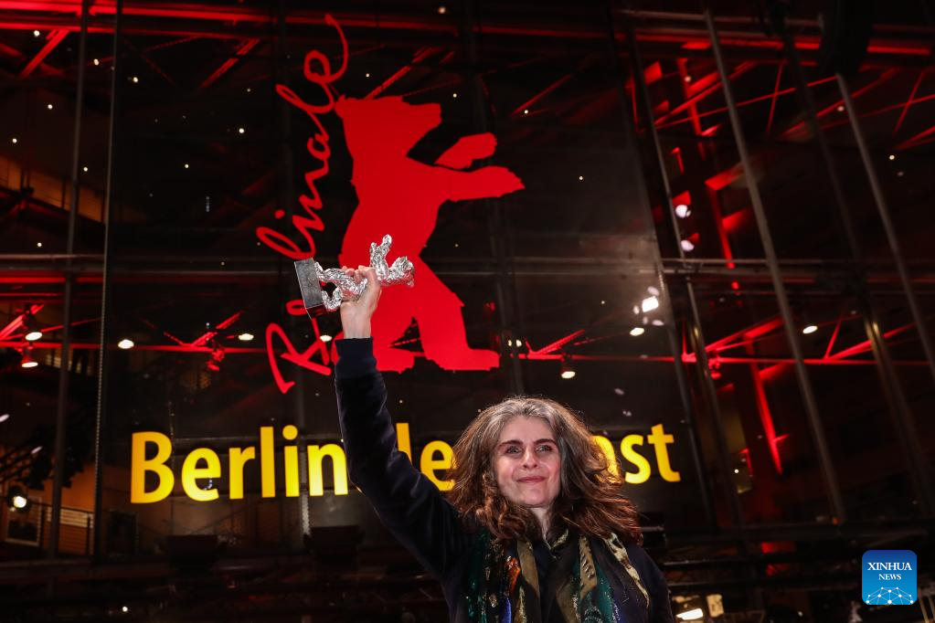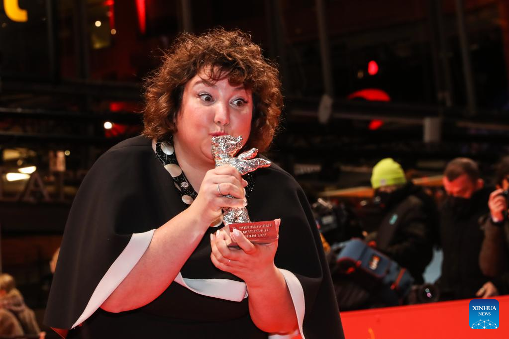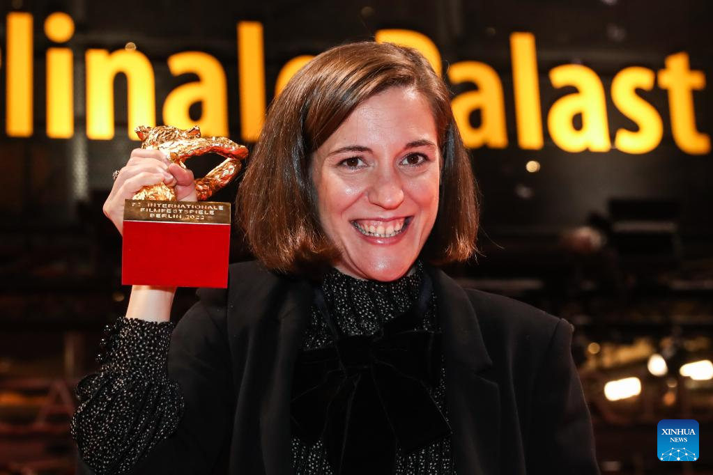 Carla Simon, director of the film "Alcarras", poses for photos after receiving the Golden Bear during the 72nd Berlin International Film Festival in Berlin, capital of Germany, Feb. 16, 2022. (Xinhua/Shan Yuqi)