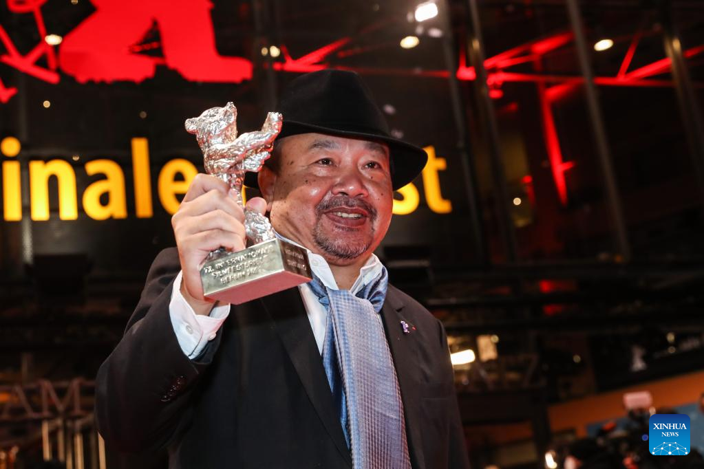 Rithy Panh, director of the film "Everything Will Be Ok", poses for photos after receiving the Silver Bear for Outstanding Artistic Contribution during the 72nd Berlin International Film Festival in Berlin, capital of Germany, Feb. 16, 2022. (Xinhua/Shan Yuqi)