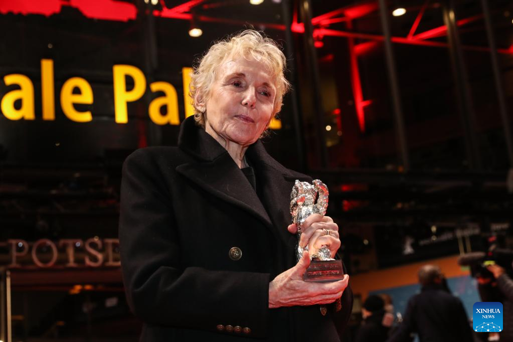 Claire Denis, director of the film "Both Sides of the Blade", poses for photos after receiving the Silver Bear for Best Director during the 72nd Berlin International Film Festival in Berlin, capital of Germany, Feb. 16, 2022. (Xinhua/Shan Yuqi)