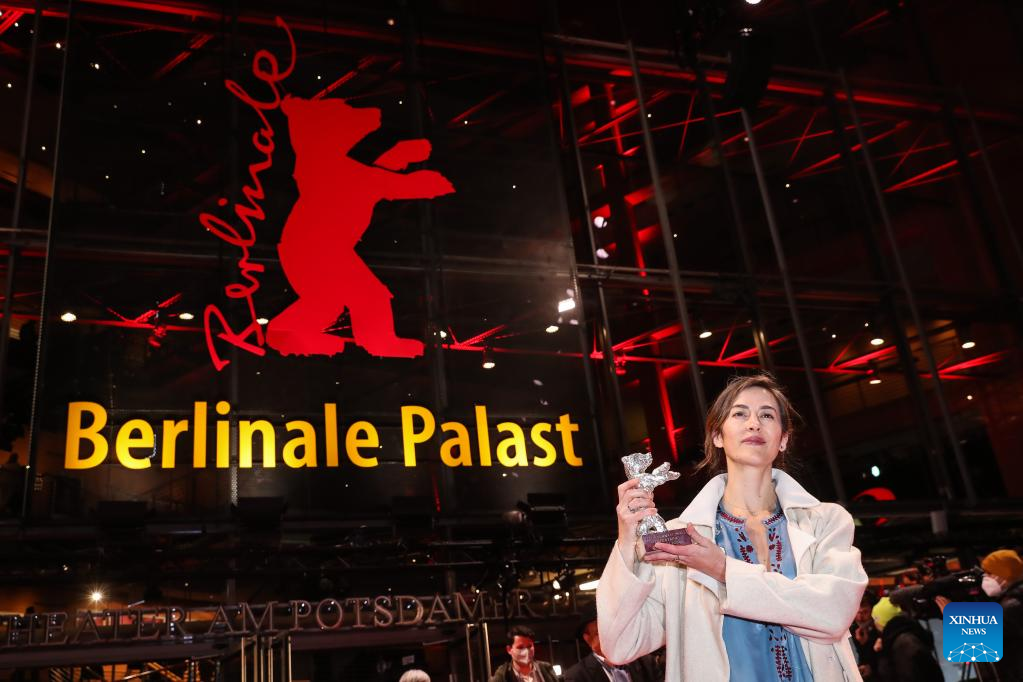 Actress Meltem Kaptan, who starred in the film "Rabiye Kurnaz vs. George W. Bush", poses for photos after receiving the Silver Bear for Best Lead Performance during the 72nd Berlin International Film Festival in Berlin, capital of Germany, Feb. 16, 2022. (Xinhua/Shan Yuqi)